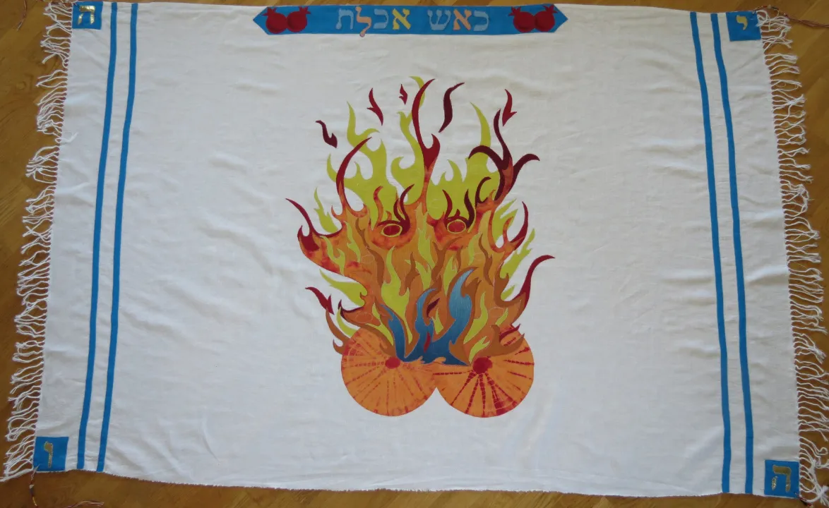 The Hebrew on the crown comes straight from Exodus 24:17: “k’esh okhelet” (כְּאֵשׁ אֹכֶלֶת)—“like a devouring fire.” Yet the body of this Tallit is strikingly clear, carrying a pattern so potent it feels alive.