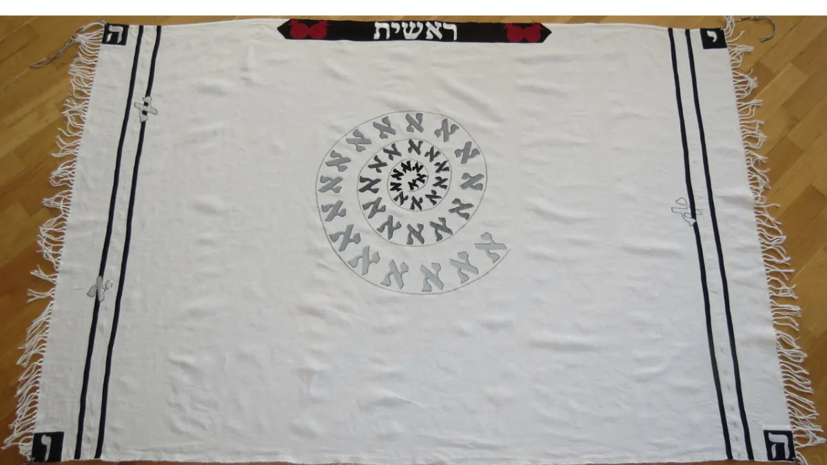 White Tallit spirals with countless Alephs — the originator, the spark, the “beginning.”