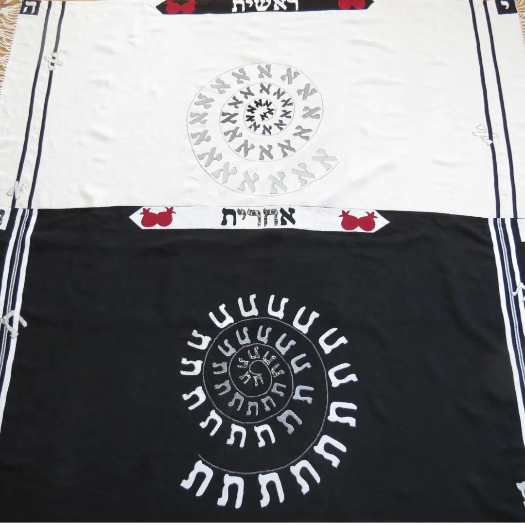 Black Tallit spirals with countless Tavs — the completer, the visionary, the one who brings fullness, fulfillment, and “completion.”